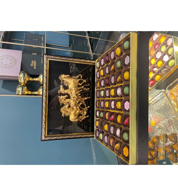 48li Atlı kutu altın varaklı spesiyal karışık çikolata.İçeriğinde portakal muz antep fıstık vişne türk kahveli lotus bisküvi pralin badem misket limon çilek frambuaz salep yaban mersini vardır.